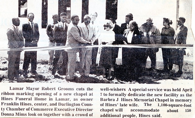 In 1975, the entire funeral home was remodeled inside and out including the addition of a completely new state of the art preparation room. In 1977, the business expanded by opening a new facility in Lamar, South Carolina. In 1986, the Gilbert Hines Memorial Chapel was built at the Hartsville facility in honor of one of the original founders. A similar chapel was built in 1991 at the Lamar facility in memory of Barbra J. Hines, the wife of Franklin Hines and it was called the Barbra J. Hines Memorial Chapel.